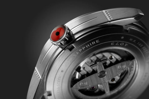 42mm in diameter, the case is shaped to follow the elliptical form of the Spitfire. From lug to case body, sapphire lens to case back, the Type 300 is an immediate form driven echo of this iconic aircraft. The crown is expertly topped by a red two petal poppy encapsulated in epoxy.