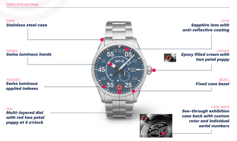 Ben France, Head of Corporate Partnerships of the Royal British Legion, said, "We are delighted to be working in partnership with AVI-8 and are incredibly grateful for their support. The limited-edition timepiece is a wonderful way to mark this significant moment for the Royal British Legion, when we are celebrating 100 years of supporting the Armed Forces community. The funds raised from sales of the timepiece will ensure we can continue to provide life-long support to all serving and ex-serving personnel and their families."