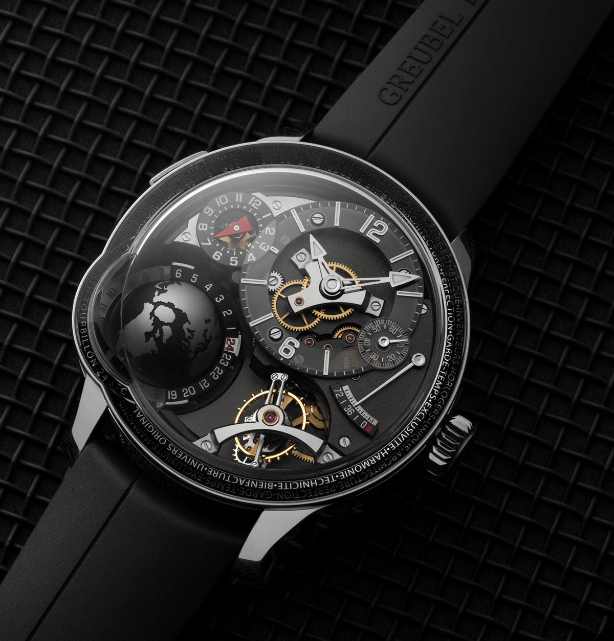 GMT • 2nd time zone • rotating globe with universal time and day-and-night • complete and global view from northern to southern hemisphere • universal time on 24 time zones • summer and winter time • cities observing summer time • lateral window showing the equator • GMT pusher • Tourbillon 24 Secondes • hours and minutes • small seconds • power-reserve