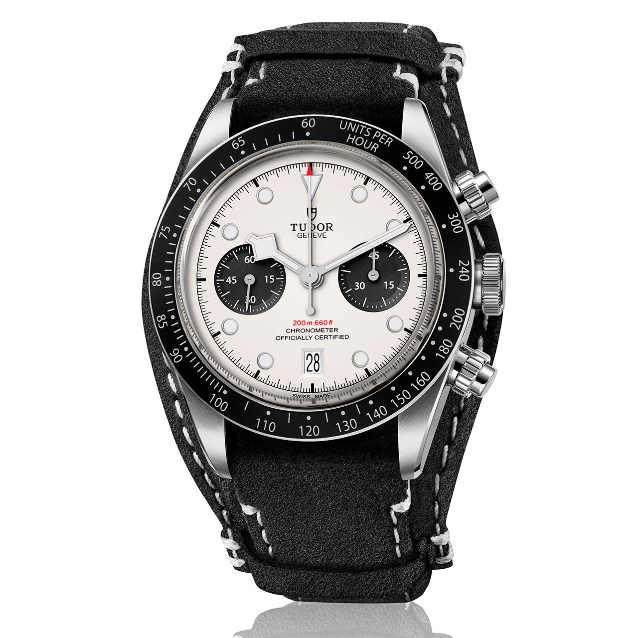 The next thing (which was impossible to miss) that I noticed was that gorgeous silvery cream-colored dial. The dash of red at 6 o’clock noting the depth rating and the red tipped chrono seconds hand provide a welcome pop of color on this monochromatic pallet. The black sub dials provide the full “panda” experience. Thankfully Tudor elected to forego any texturing on the sub dials which never sat particularly well with me. This beautiful dial is rimmed by a (totally useless) tachymeter bezel, an odd choice for a diving watch, in black aluminum. To cap it all off a wonderfully transparent sapphire crystal that is easy to forget is even there completes the package.