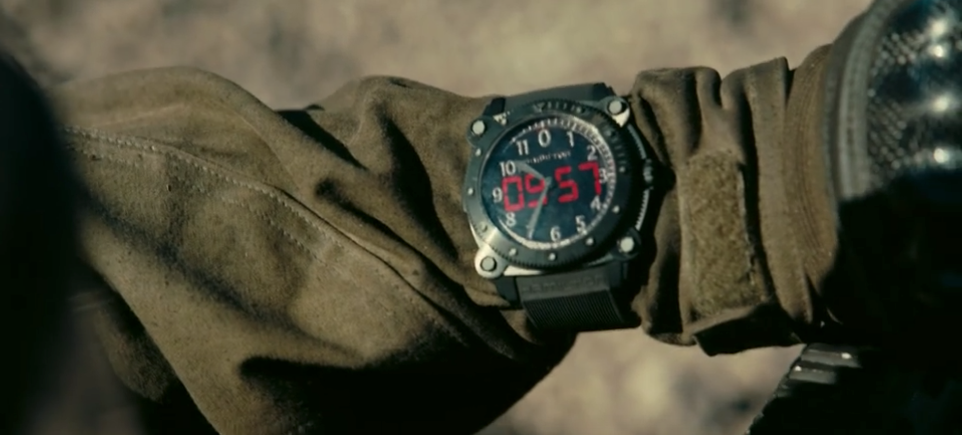 During the final action sequence in Siberia, we get a close look at the custom watch Hamilton provided the filmmakers. It was based on the Khaki Navy BelowZero but featured an LED digital display on the traditional analog dial. Those wearing watches with red LED displays are traveling forward in time. Those with blue LED displays are going backward. This is an essential detail in the final action sequence where the good guys perform a temporal pincer movement where half the team moves forward in time, jot down notes, and then provides those to the other half traveling backward in time.