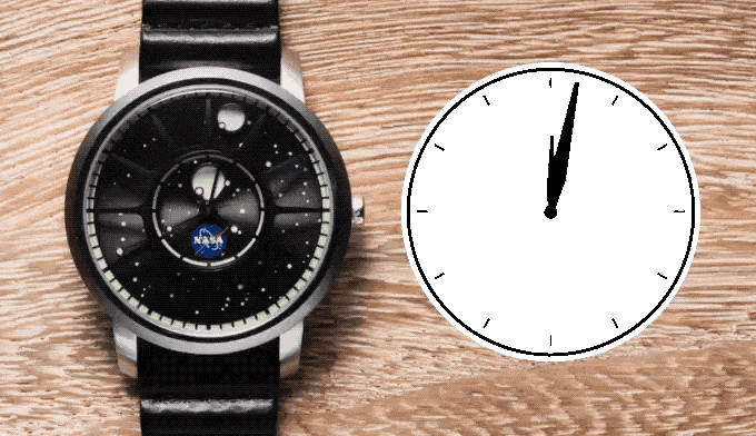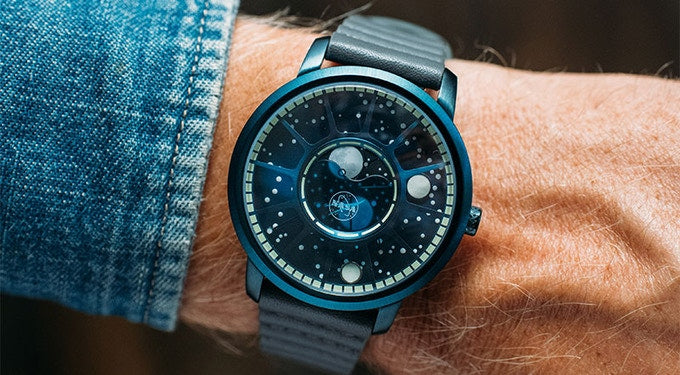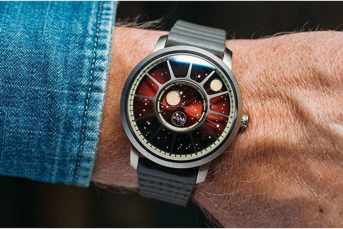 They continued with their signature method of time telling with orbiting moons as watch hands. Hours and minutes rotate around the dial, making it an easy read on a unique display.