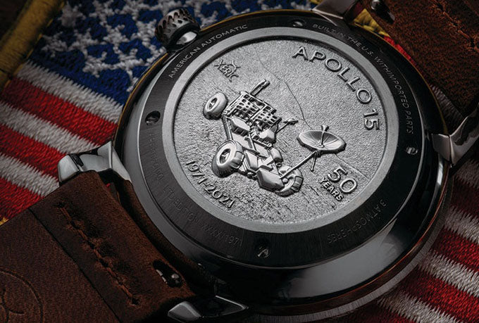 The Apollo 15 features a coin-engraved solid steel caseback depicting the lunar rover where it sits today and commemorating the 50th anniversary of its arrival on the surface of the moon.